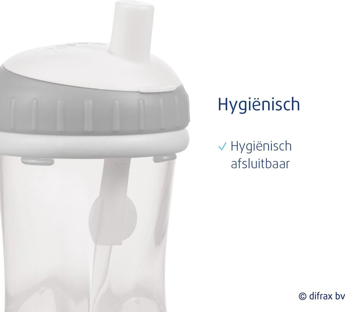 De antilekfunctie voorkomt knoeien met roosvicee, water of sap als je peuter aan het rietje zuigt. De oranje drinkbeker heeft een zacht rietje met een speciaal geïntegreerd antileksysteem.