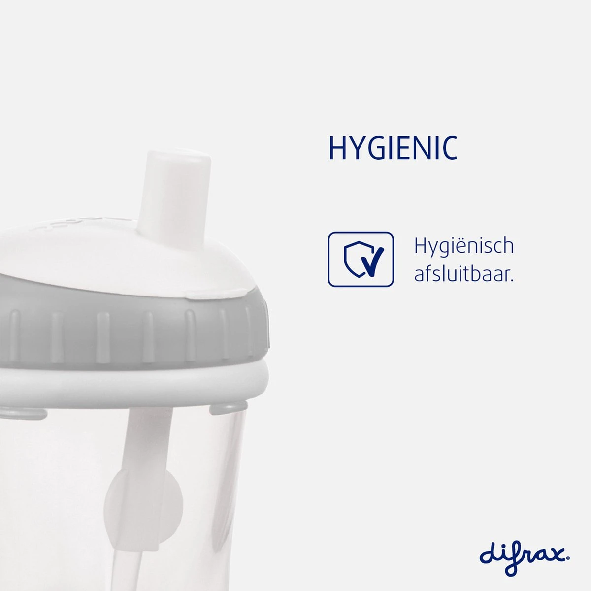 De drinkbeker heeft een zacht rietje met een speciaal geïntegreerd antileksysteem. Zodra je kind op het rietje zuigt, gaat het rietje open en stroomt de sap door het rietje.
