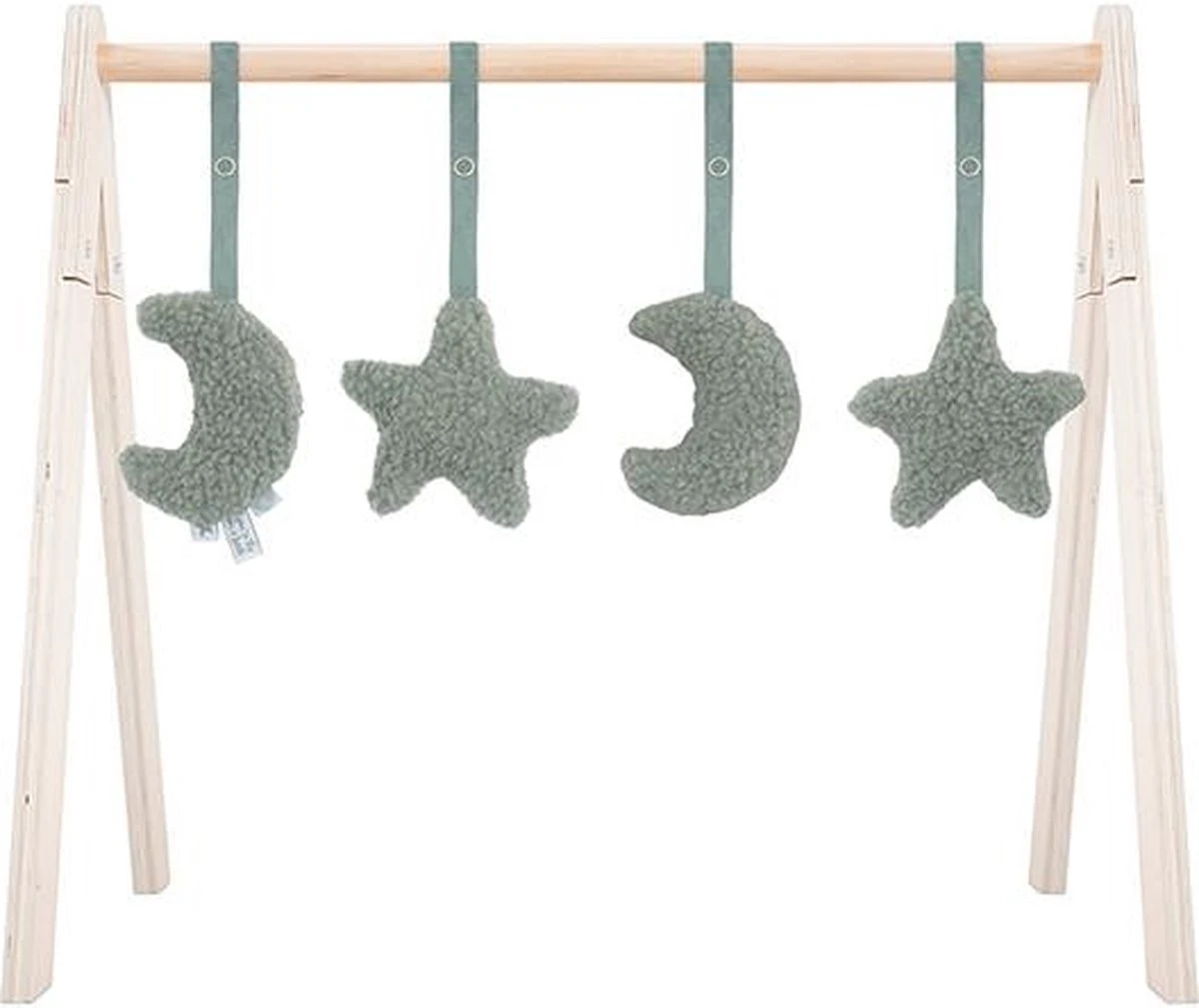 Deze vier speelfiguurtjes zijn geschikt voor gebruik in combinatie met de Jollein houten babygym. Het is van zachte teddystof in roze, nougat of groen. Vanaf ongeveer 10 weken krijgt je baby steeds meer behoefte aan prikkels, spelen en rondkijken. Dat is het moment dat een babygym die extra uitdaging biedt. Haal gauw de houten babygym in huis en versier deze met deze leuke figuurtjes in de vorm van twee maantjes en twee sterren. Leg je baby er onder op een zachte ondergrond en het spelen kan beginnen! De bewegingen van de speeltjes aan de babygym vindt je baby fascinerend om te zien. Hij zal enthousiast met zijn voetjes trappelen of geluidjes gaan maken als hij een speeltje weet te grijpen of aan te tikken zodat het nog meer gaat bewegen. Het gebruik van de babygym stimuleert de ontwikkeling van de grove en fijne motoriek. Het prikkelt de zintuigen. Bovendien krijgt je baby steeds meer controle over zijn grijptechnieken en het leert dat speeltjes meer gaan bewegen als je er tegen aan tikt of speeltjes vastgrijpt. Heel waardevol dus, zo’n babygym. De babygymspeeltjes van Jollein worden exclusief de houten babygym geleverd. De babygym is los verkrijgbaar en gemakkelijk in elkaar te zetten. In de Jollein collectie zijn meerdere bijpassende babygymspeeltjes verkrijgbaar. Je kunt de babyspeeltjes makkelijk bevestigen en weer verwijderen. Daardoor kun je afwisselen met de speeltjes en blijft het voor je baby interessant en uitdagend.