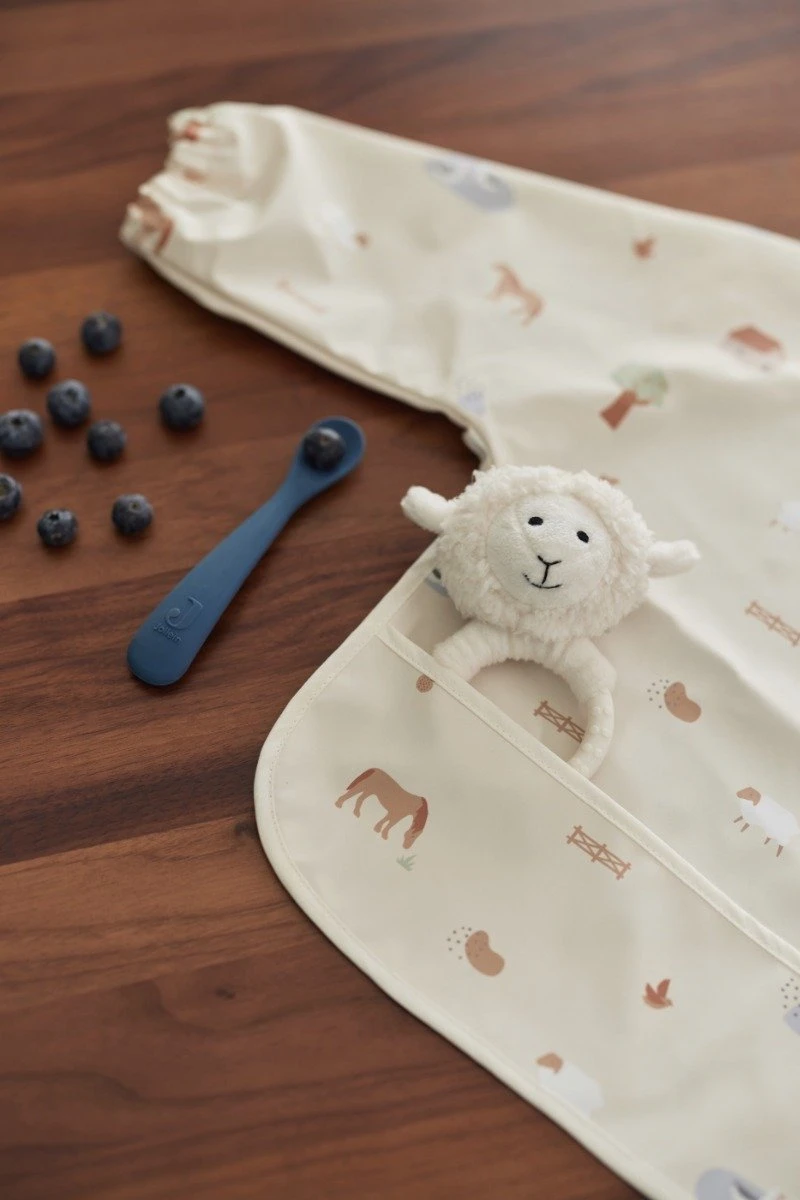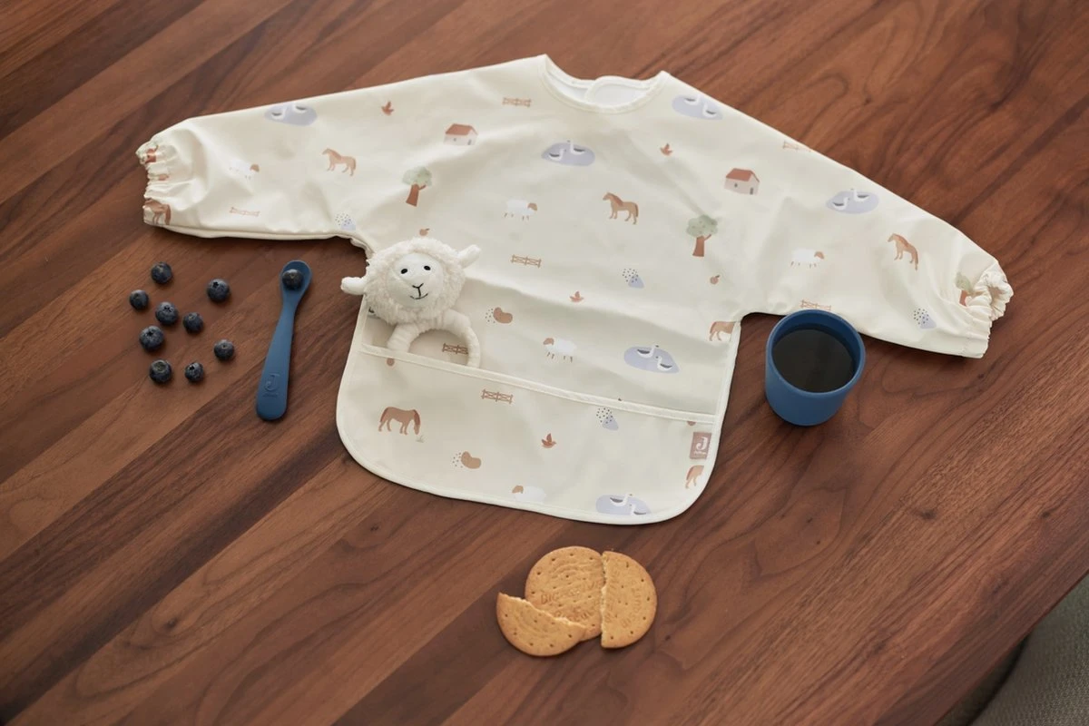 Deze slab met mouwen is geweldig. Het is een soort schortje en beschermt de kleertjes van jouw baby of dreumes extra goed door die mouwtjes.