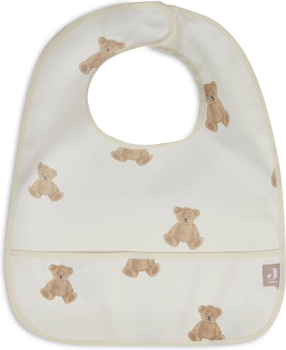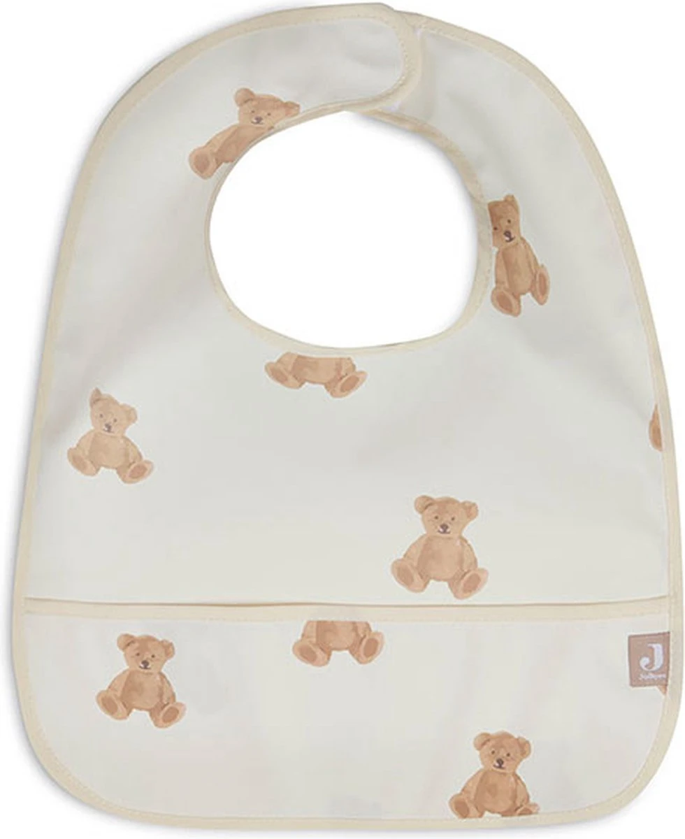 Je sluit de waterproof slab met klittenband aan de achterzijde. Dat blijft goed zitten waardoor je baby niet gemakkelijk zelf de slab kan uittrekken. De slab is afneembaar met een vochtige doek. De slab heeft een leuke Teddy Bear print.