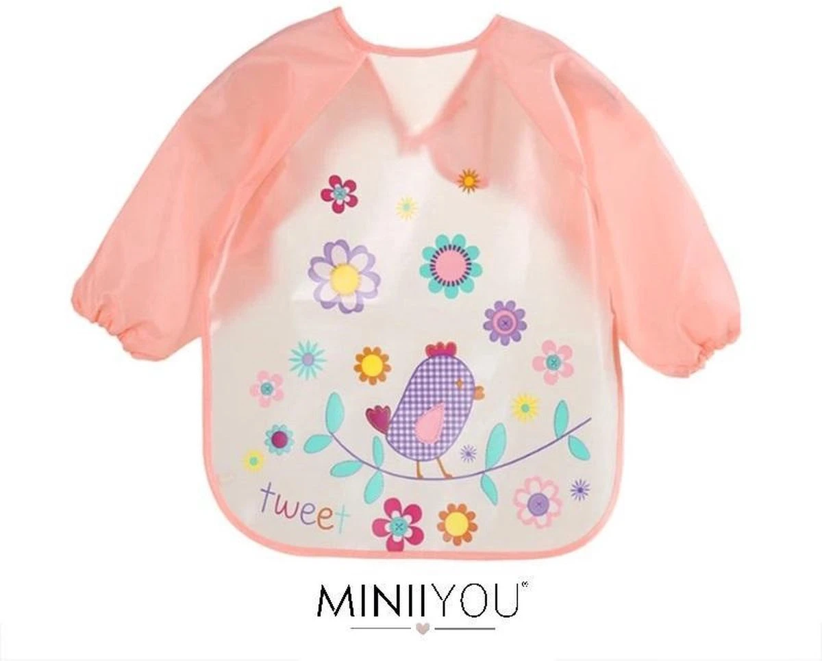 Deze leuke kunststof Slabber met lange mouwen beschermt de kleding van jouw MINII tegen nare etensvlekken en etensresten.