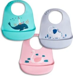 Hippe siliconen slabbers met walvis, zwaan en olifant afbeelding voor de allerkleinsten. Deze slabber is voorzien van een handig opvangbakje voor de restjes eten die geknoeid worden tijdens het eten. De slabber is verstelbaar waardoor deze slabber geschikt is voor kinderen vanaf o tot 4 jaar en lekker lang mee kan.