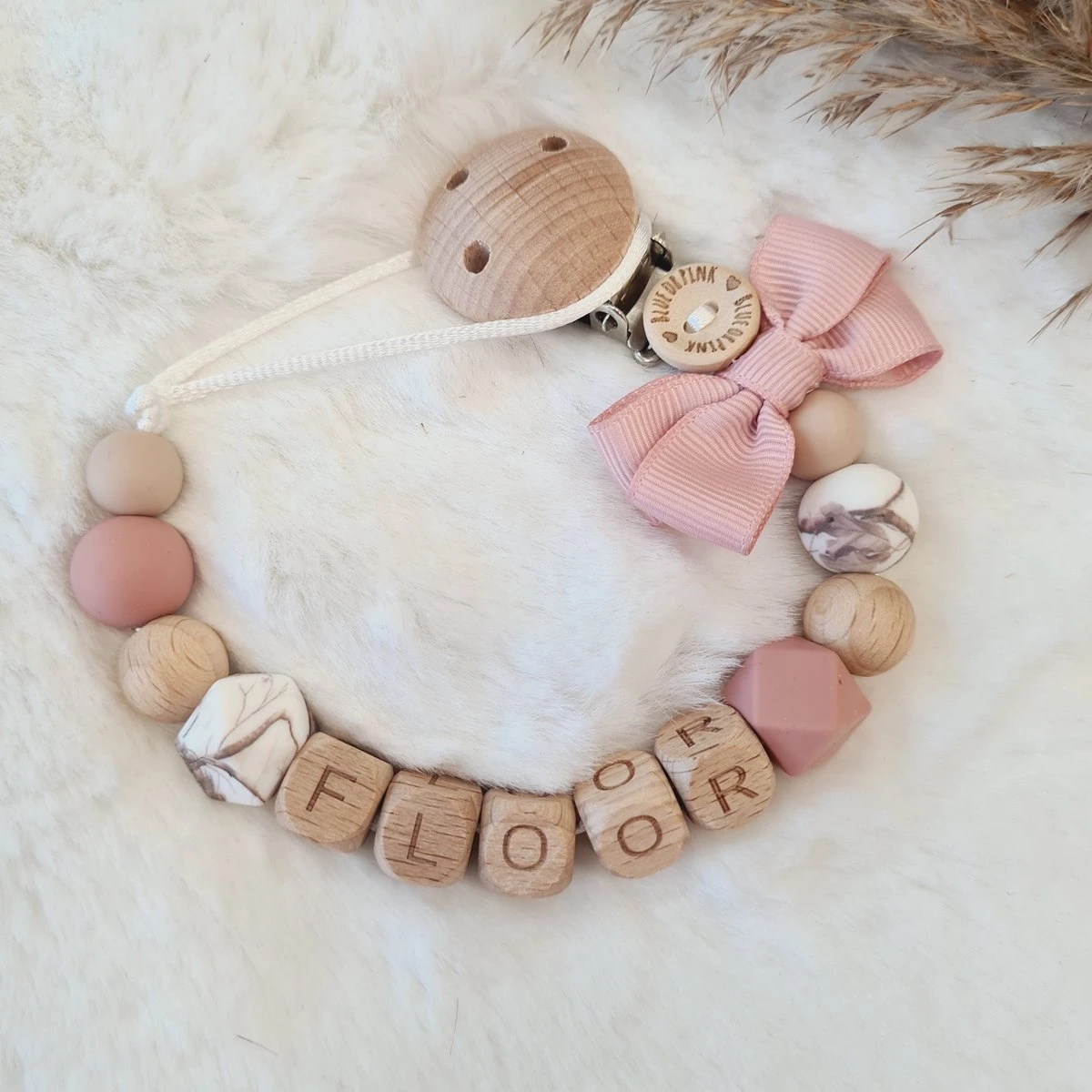 Dit speenkoord ontworpen door Blue or Pink is afgewerkt met een beukenhouten clip en vintage roze strik! De siliconen kralen zijn een mix van vintage roze, zand en de hippe marble blush kralen. De letterkralen zijn van beukenhout maar kunnen ook in siliconen! Dit speenkoord is lekker girly en schattig. Hier kunnen kleine meisjes mee voor de dag komen!